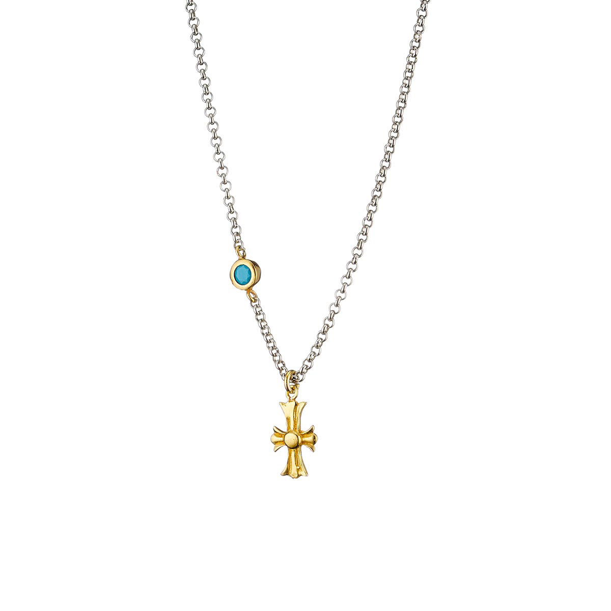 Sterling silver necklace with turquoise cz and cross element in gold plating.
